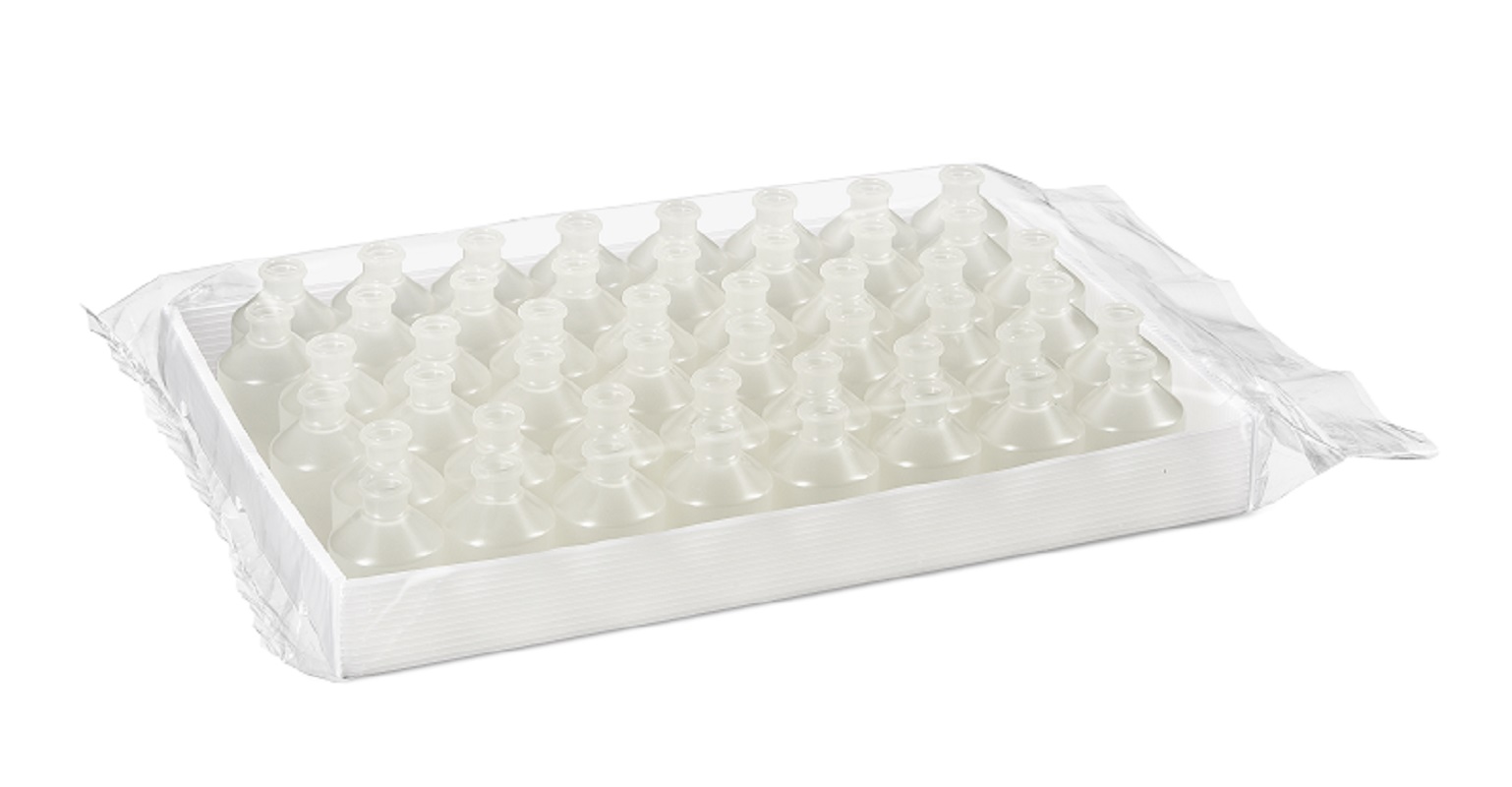 50 ml Polypropyleen injectieflacon. Geproduceerd in cleanroom Klasse C 10.000 en verpakt per 48 stuks op speciale kunststof tray in dubbele PE cleanroom zak. Voorspoelen niet noodzakelijk. Materiaal PP conform Europese Farmacopee.
